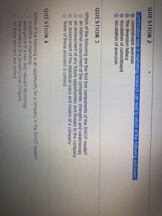 Confirmation bias in marketing research can pb to which of the following outcomes? delivery aversion the diversion fallacy escalation of delivery escalation of aversion Which of the following are the first two components of the SWOT model? an internal assessment of the companies strengths and weaknesses an assessment of any future opportunities and threats to the company an cess of the statistical ways and means of a company None of these answers is correct. Which of the following is an opportunity for a company in the SWOT model? expertise in marketing emergence of a new and relevant technology the beingness of a powerful rival company All these answers are correct.